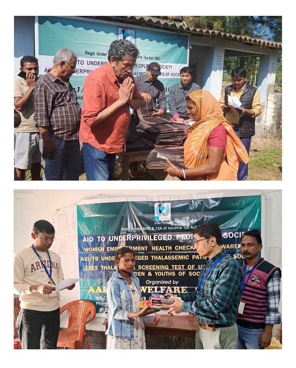 Thalassemia Awareness Camp and Free Thalassemia Screening Test Camp in the district of JHARGRAM on January 11, 2026 where Hb HPLC Test & Blood Group RH factor test done among forty two numbers of particularly vulnerable tribal group students and virtually the inaugural speech given by Hon'ble President of organization Sri Sabyasachi Chakrabarty followed by the speech on prevention and care for thalassaemia patients by Dr. Souvik Sardar & Dr. Debmalya Bhattacharyya, MD DM Hematologist (virtually). Books & study materials distributed among six PVTG / sabar students of class IX & X along with new blankets distributed among sixty five underprivileged (PVTG) aged & ailed persons of remote different villages in Belpahari, Jhargram by Chiranjib Goswami, Secretary, Arup Kumar Pal, Assistant Secretary, Sudip Chatterjee, Treasurer, Dr. Souvik Sardar, Raja Chakraborty & Shyamal Mistri, the members of organization.